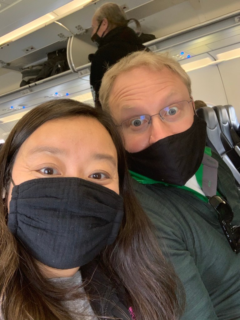 Two people who are super excited to be on a plane again!!