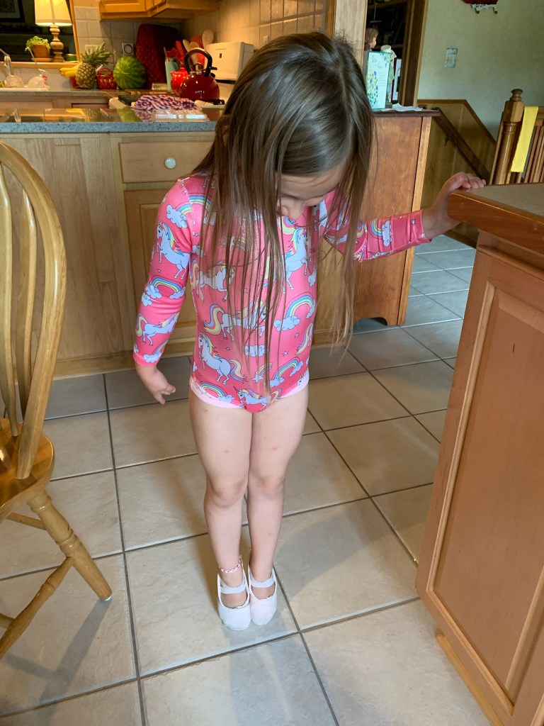 She decided she wanted to do pointe and since she didn’t have pointe shoes, she put pink erasers into the toes of her regular ballet shoes.